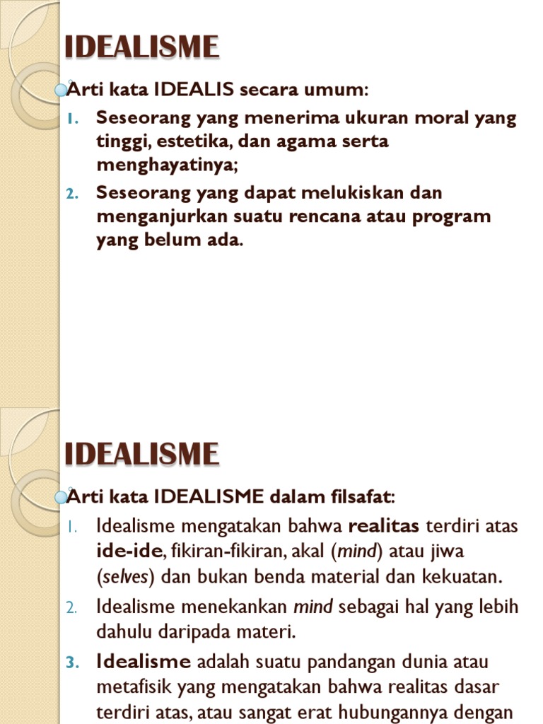 . Idealis adalah orang yang bertindak berdasarkan pengalaman empiris yang unik pikiran dan cita-cita tinggi untuk mencapai hasil maksimal. Seorang idealis juga memiliki suatu pengaruh positif karena ia dapat memperlihatkan antusiasme dan keyakinan penuh melalui keterlibatan. Bantu kami share data ini untuk membantu.