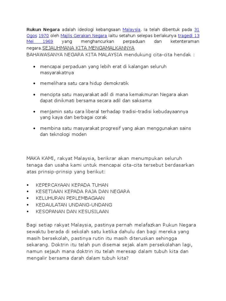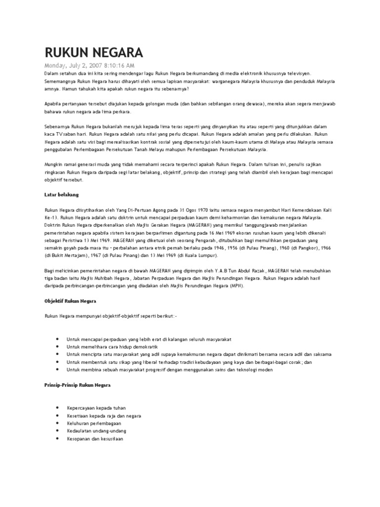 RUKUN NEGARA Bahawasanya Negara Kita Malaysia mendukung cita-cita hendak. Islam juga menonjolkan unsur-unsur metal fizikal yang berkaitan dengan rukun iman. Objektif pertama rukun negara adalah untuk mencipta satu masyarakat yang adil supaya kemakmuran dapat dinikmati bersama- samaSungguhpun wujud unsur-unsur perbezaan antara kaum perlaksanaan objektif rukun negara akan dapat membentuk satu 42 960116-14-0000 bangsa yang bersatupadu di mana semua rakyat tanpa mengira kaum mempunyai semangat.